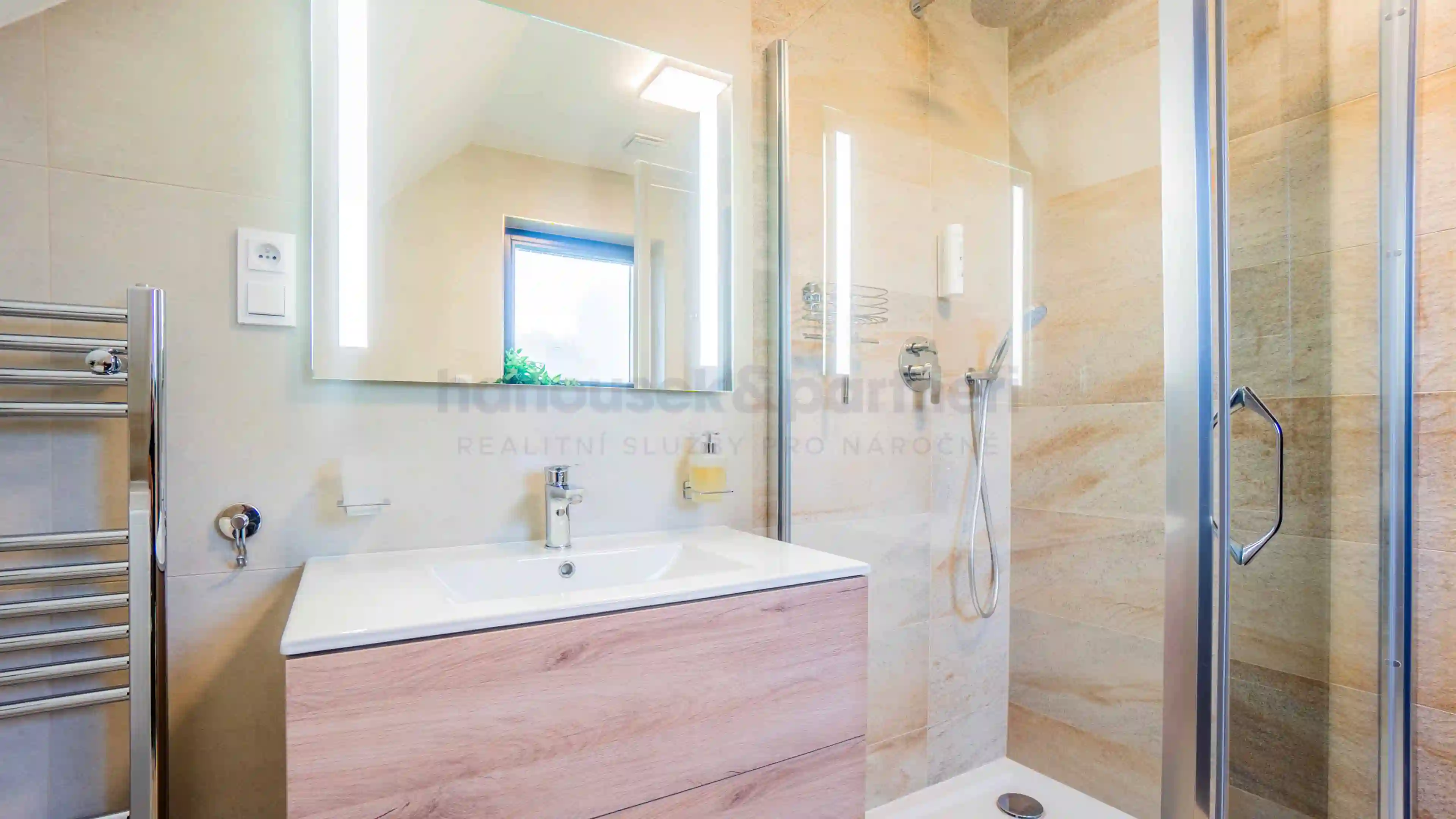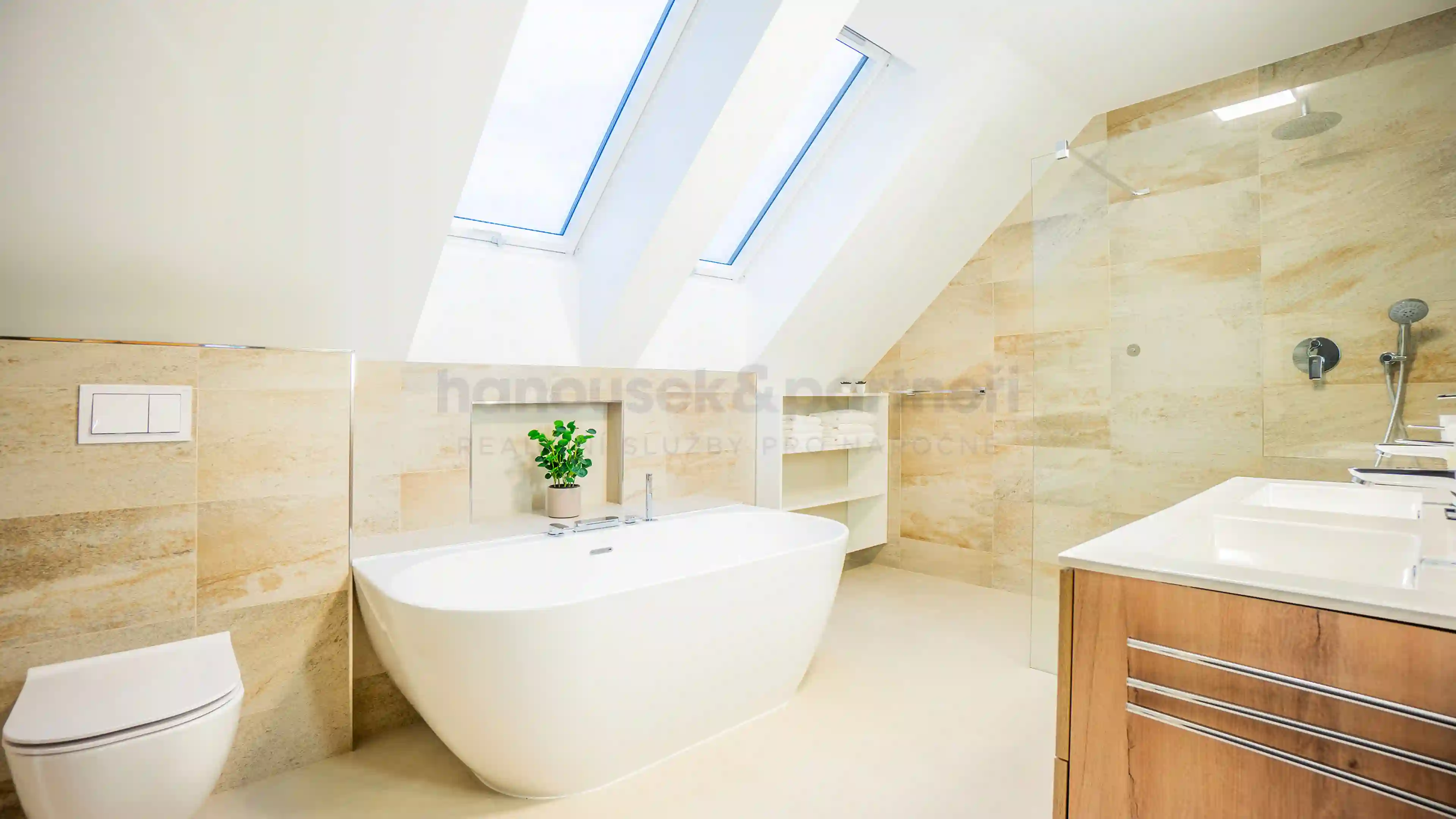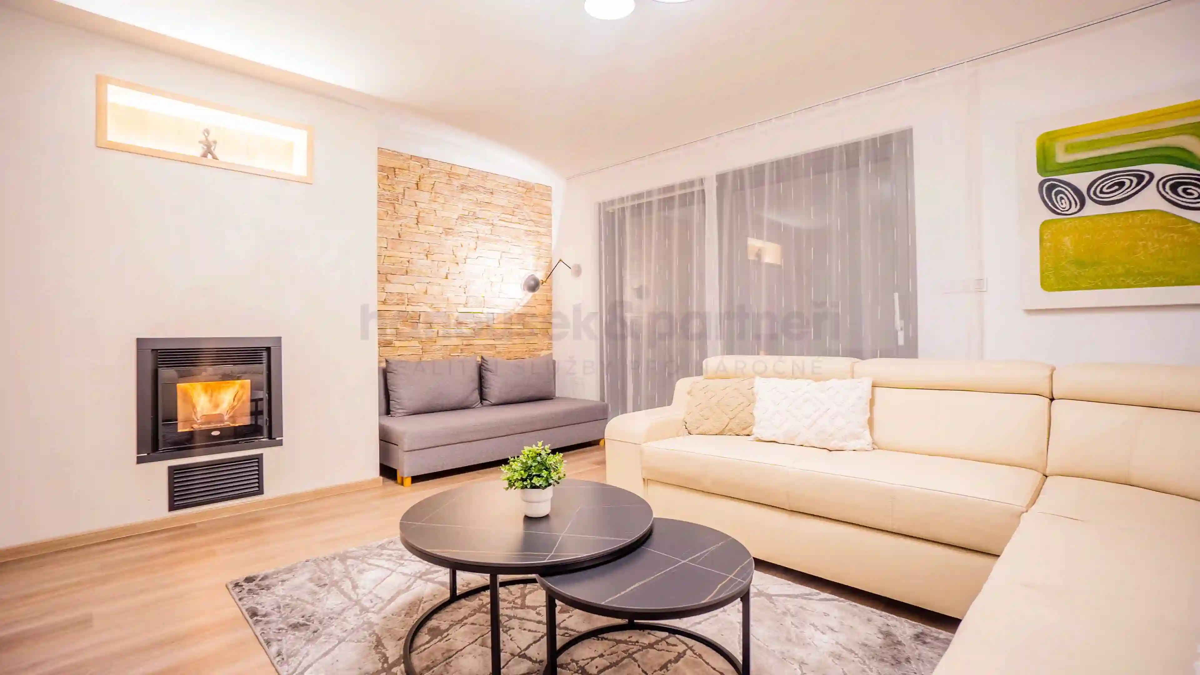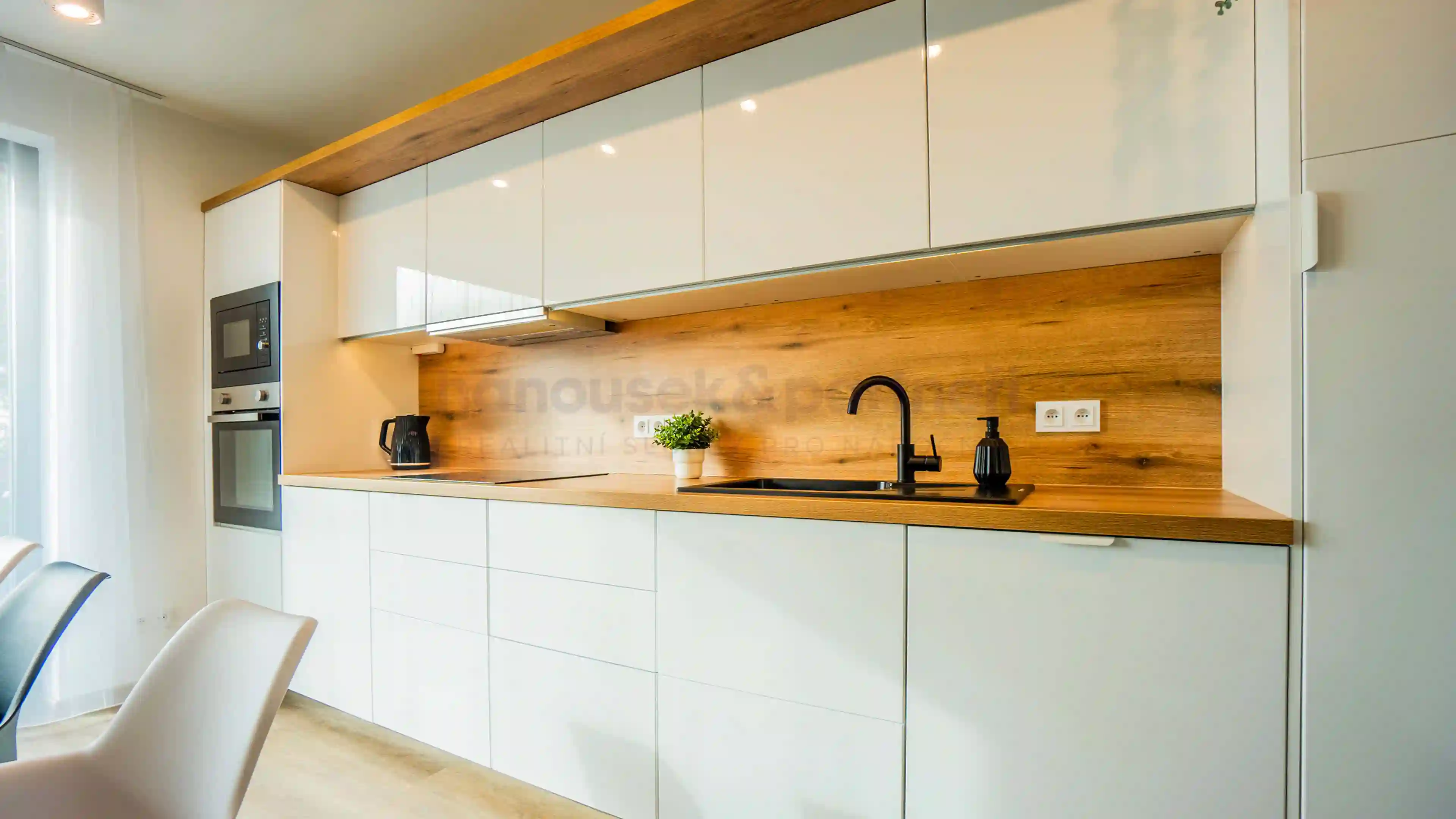 Apartmán je jedním ze dvou bytů v cihlové rodinné novostavbě. Má dispozici 3+kk a celkovou výměru 119 m2. V přízemí je obývací pokoj s kuchyní a vstupem na terasu, pracovna a samostatné WC. V patře jsou dvě ložnice a dvě koupelny.