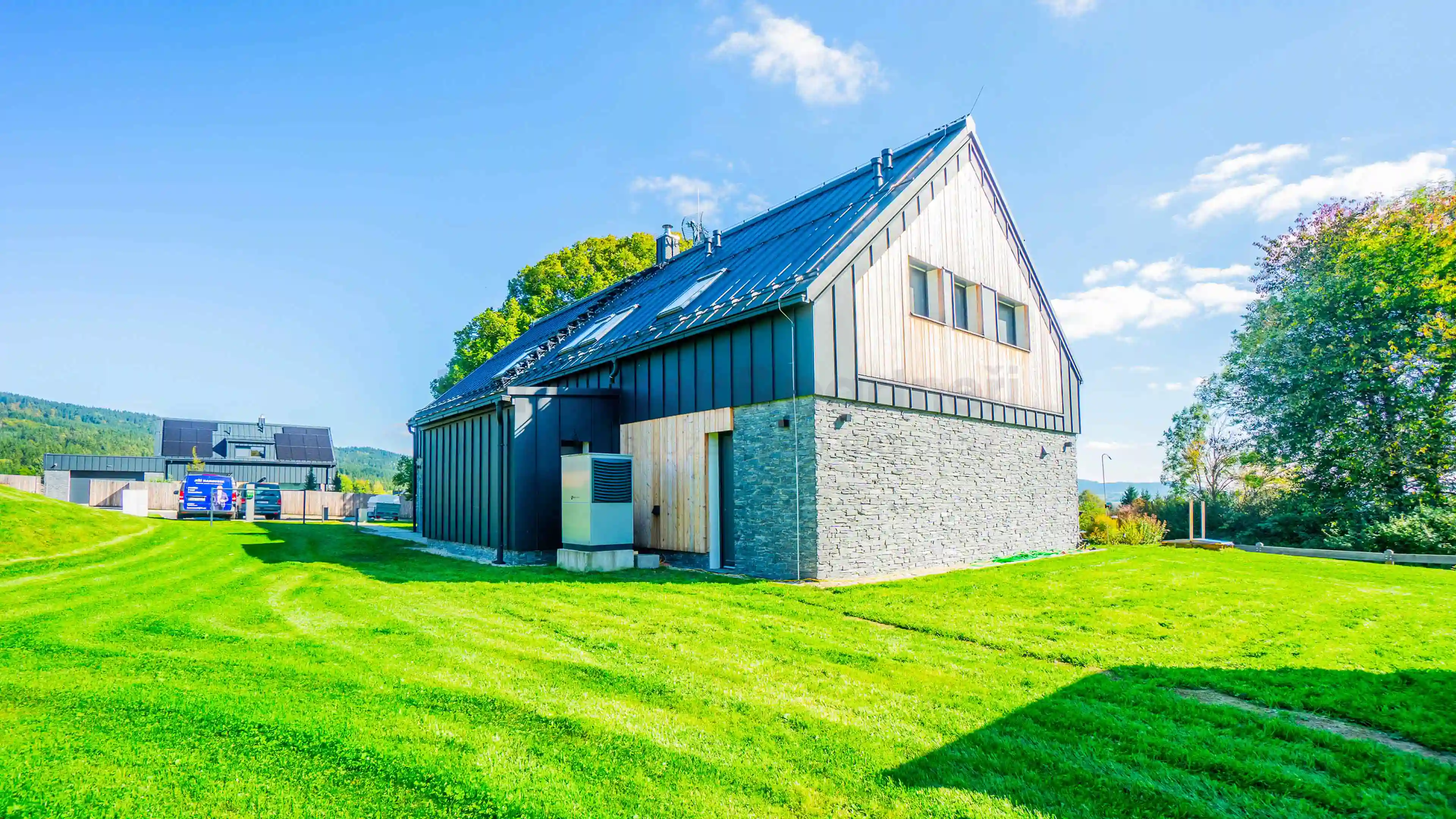 Stavba byla zkolaudována v roce 2023, je cihlová a má plechovou střechu. Vytápění zajišťuje tepelné čerpadlo, odpady řeší vlastní ČOV. Topení a venkovní stínění ovládá chytrá domácnost Loxone. Vstup je bezkontaktní pomocí kódu. O zahradu se stará robotická sekačka.