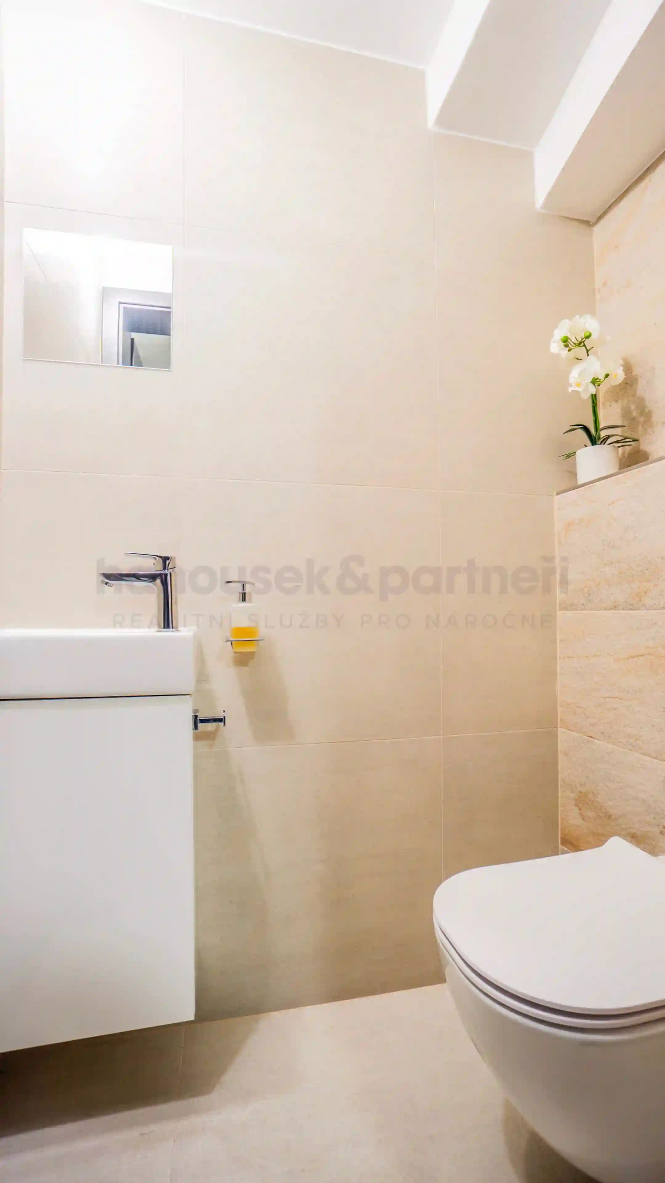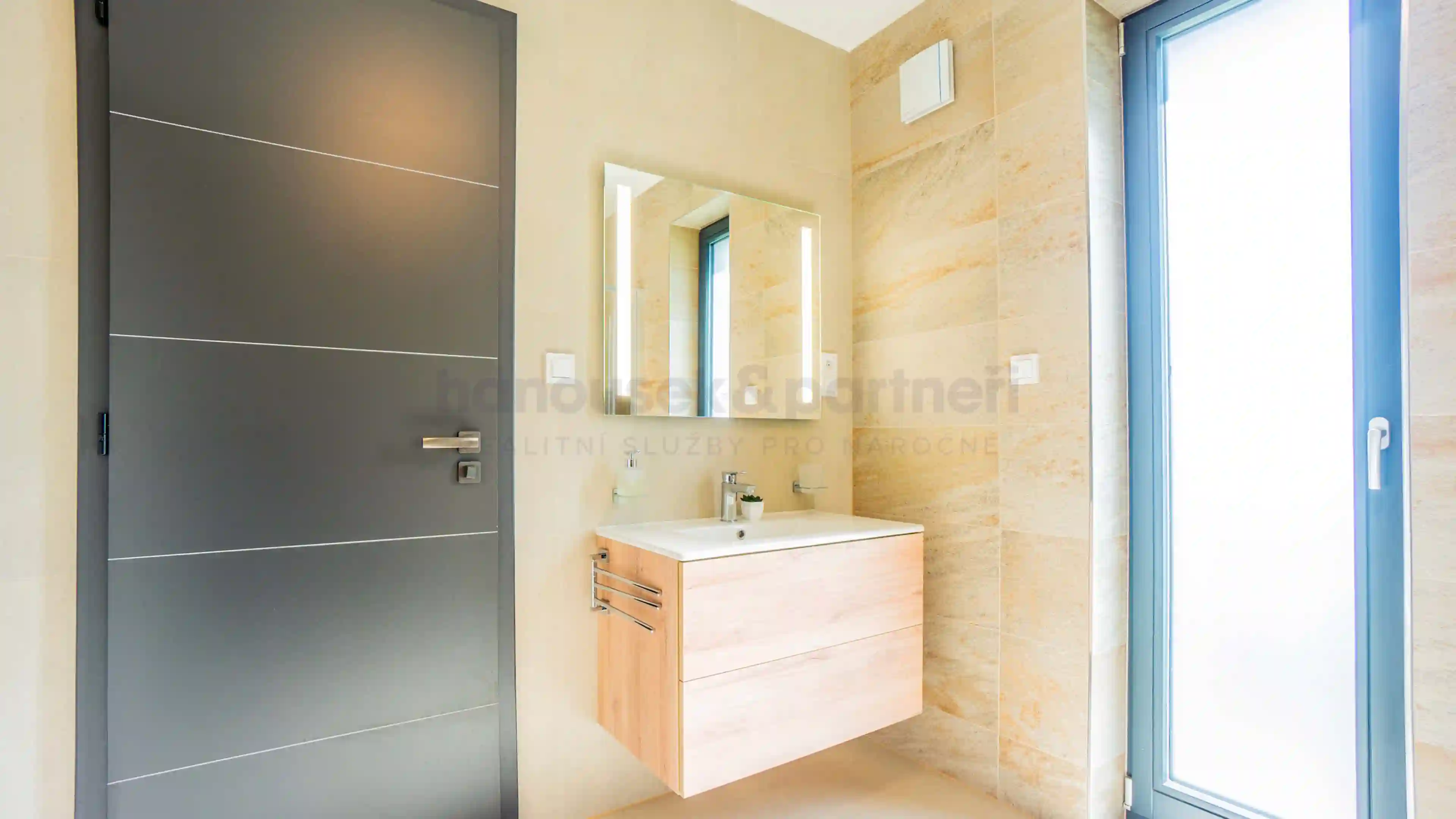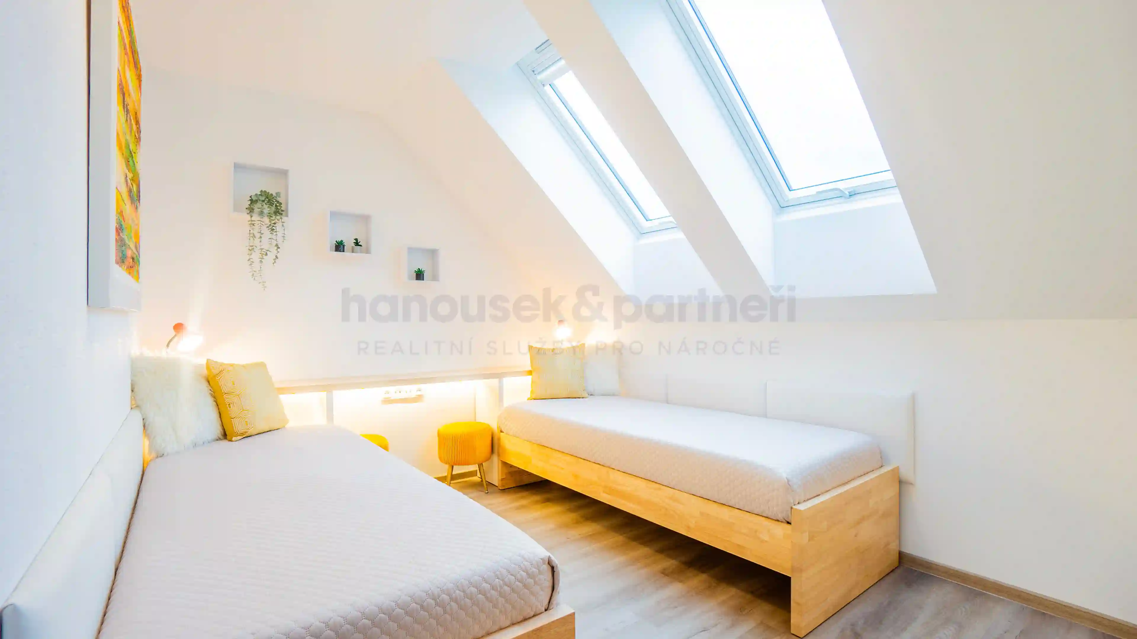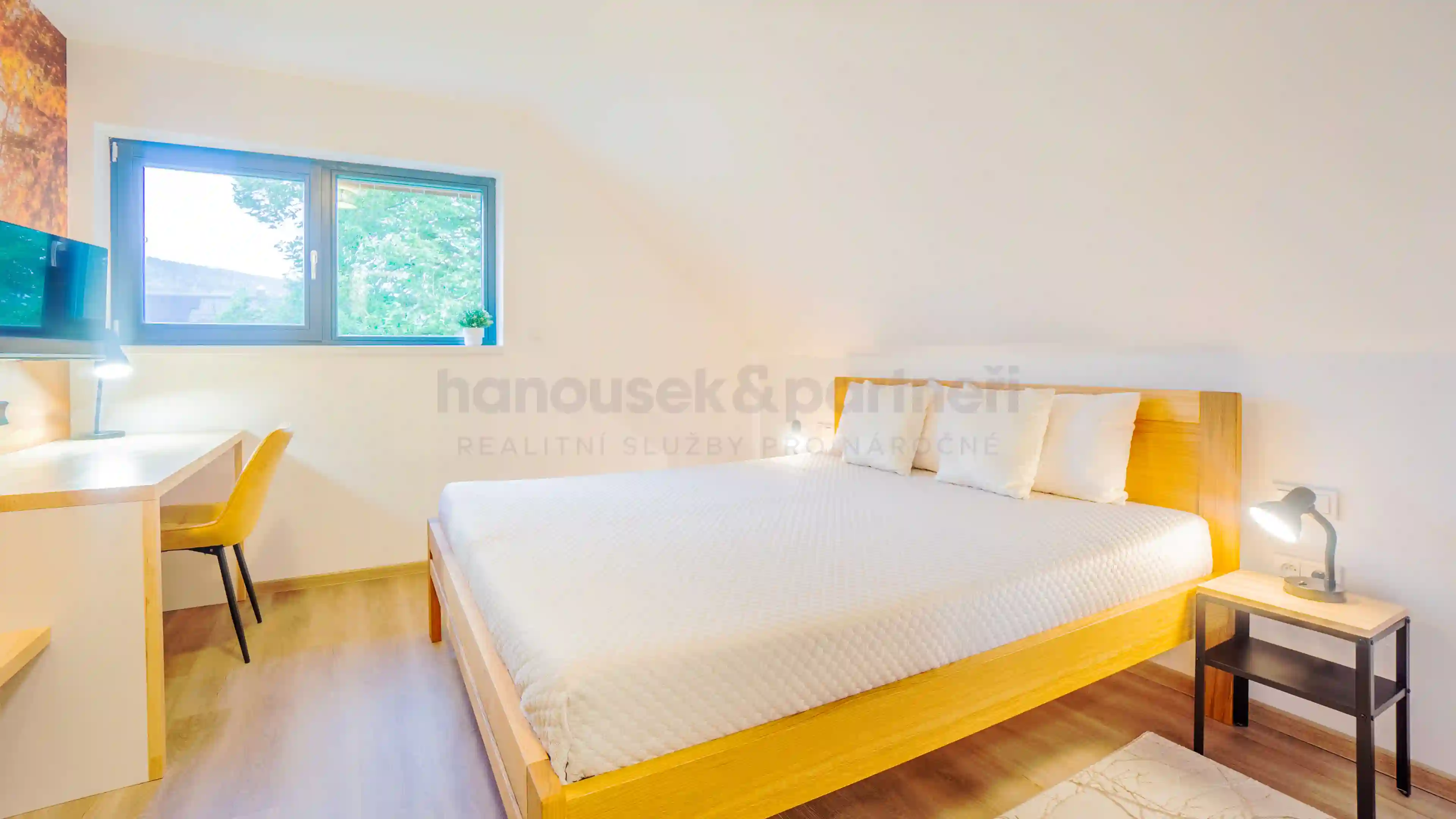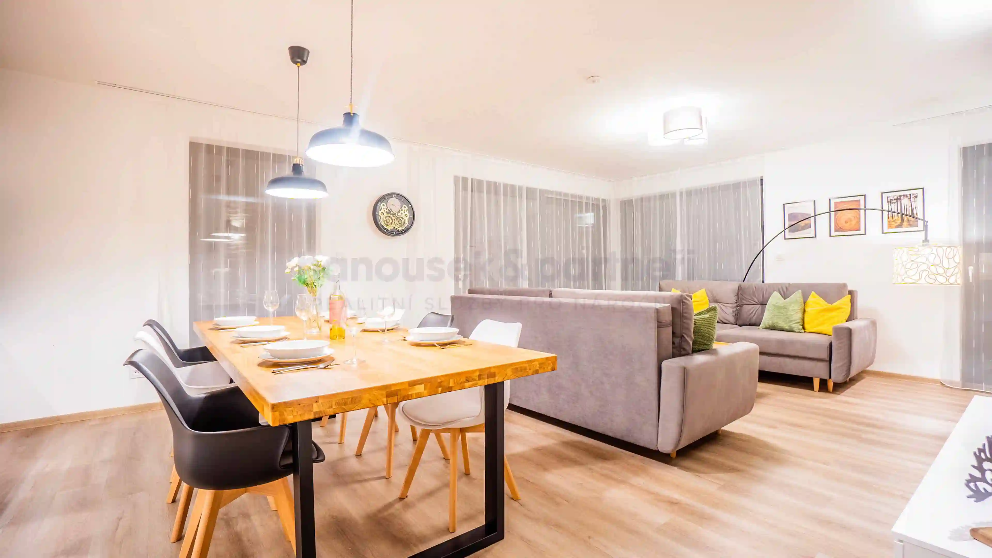 Apartmán je jedním ze dvou bytů v cihlové rodinné novostavbě. Má dispozici 4+kk a celkovou výměru 111 m2. V přízemí je obývací pokoj s kuchyní a vstupem na terasu, koupelna a samostatné WC. V patře jsou tři ložnice a koupelna.