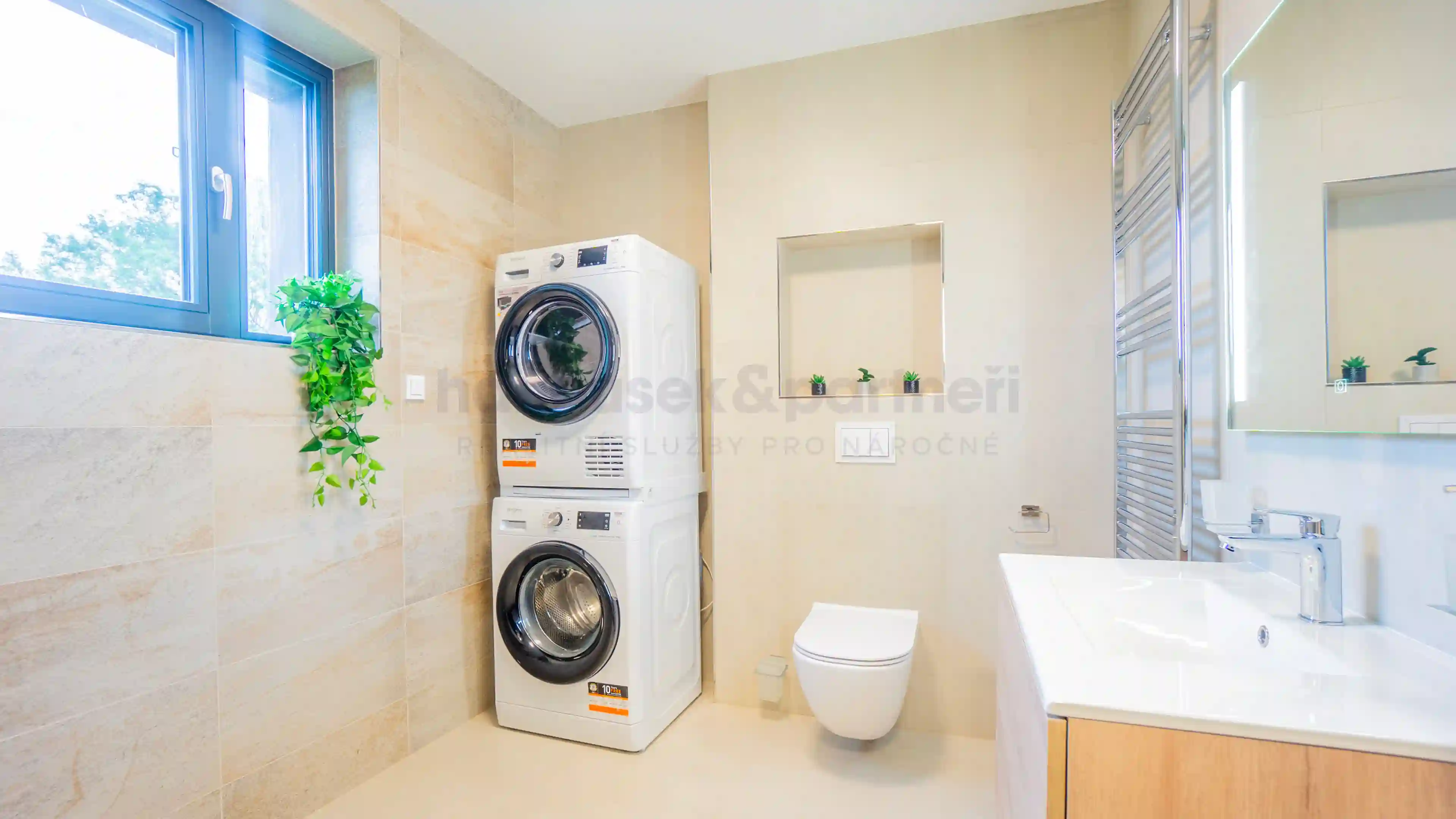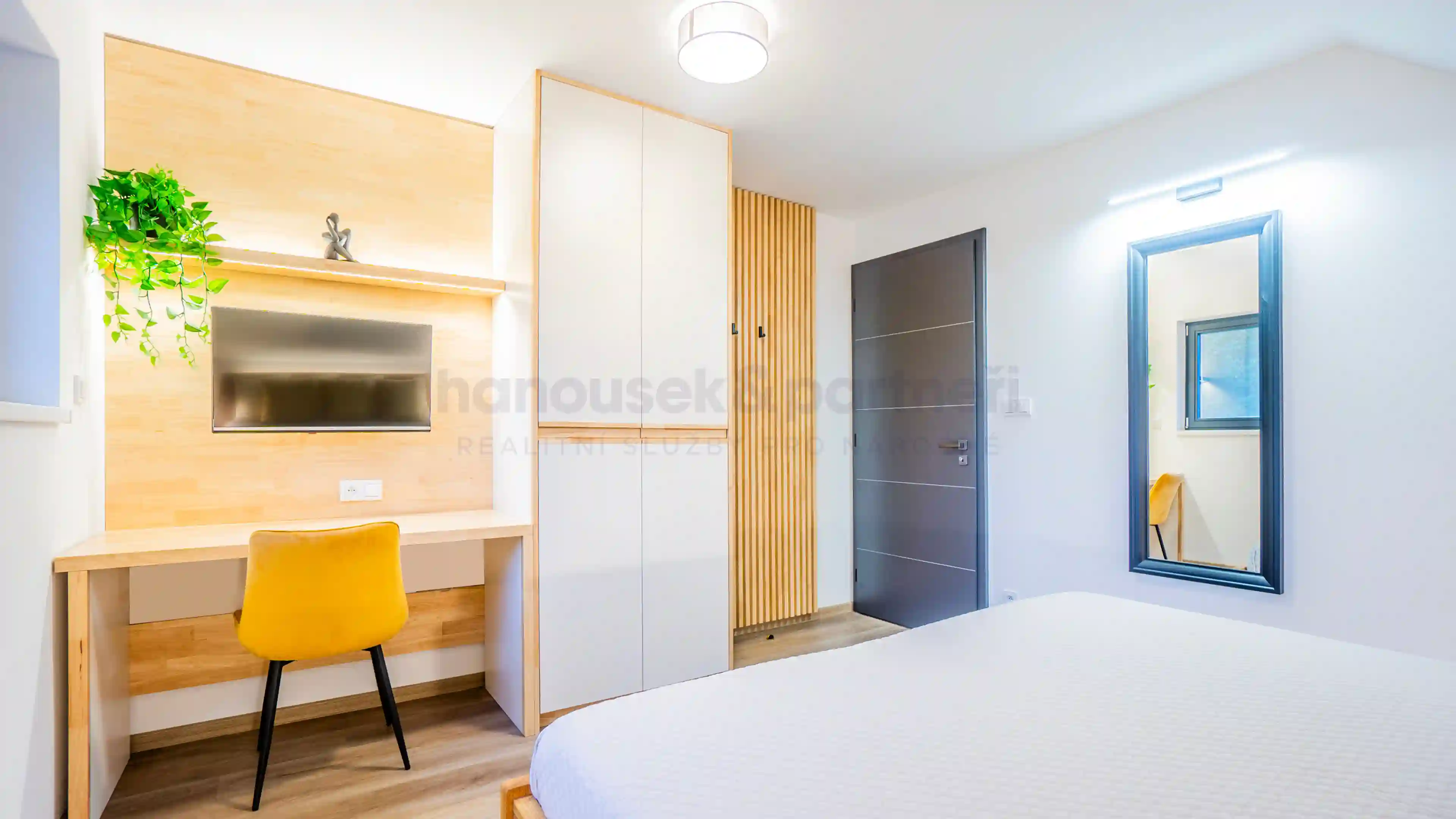 Investory taky určitě potěší, že se apartmán prodává kompletně vybavený – od masivního nábytku na míru přes spotřebiče až po ručníky. Při zařizování se myslelo na víkendové výletníky i rodiny, co tu stráví celé léto. Nechybí pračka, sušička nebo vysokorychlostní WiFi.