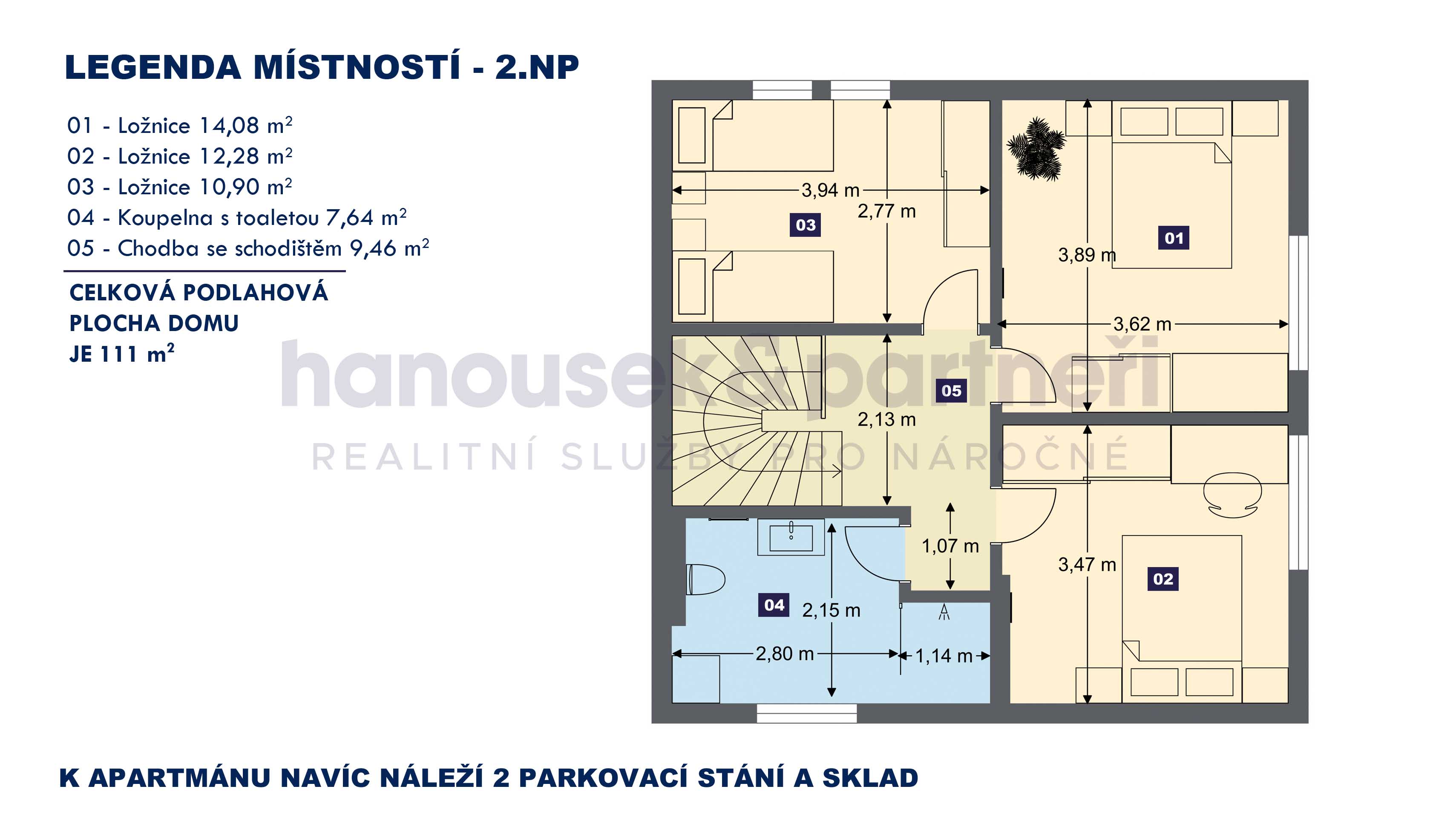 Apartmán je jedním ze dvou bytů v cihlové rodinné novostavbě. Má dispozici 4+kk a celkovou výměru 111 m2. V přízemí je obývací pokoj s kuchyní a vstupem na terasu, koupelna a samostatné WC. V patře jsou tři ložnice a koupelna.
