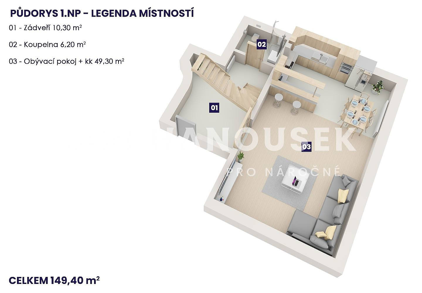 Potřebujete hodně místa? Tak to vás jistě potěší, že obývací pokoj s kuchyní tvoří prostor o výměře 49 m2. Ani na ložnicích se nešetřilo – s výměrou 26 m2 a 18 m2 vám poskytnou dostatek prostoru na všechny vaše věci, práci i odpočinek. Ve větší ložnici pak najdete i šatnu, kam můžete dát vše, co se jinam nevešlo. Hodila by se vám ještě nějaká zašívárna, extra úložný prostor nebo pracovna? Tak to oceníte dalších skoro 5 m2, které můžete využít dle svých představ. Koupelny jsou tu dokonce dvě, takže se nemusíte obávat věčného běhání po schodech. Koupelna ve spodním patře je vybavena sprchovým koutem a WC, ve vrchním patře se pak můžete těšit na relax v hydromasážní vaně. Na terasu o rozloze 9 m2 se vám vejde nejen posezení, ale třeba i gril – slunečné počasí si tedy můžete vychutnat se vším všudy.