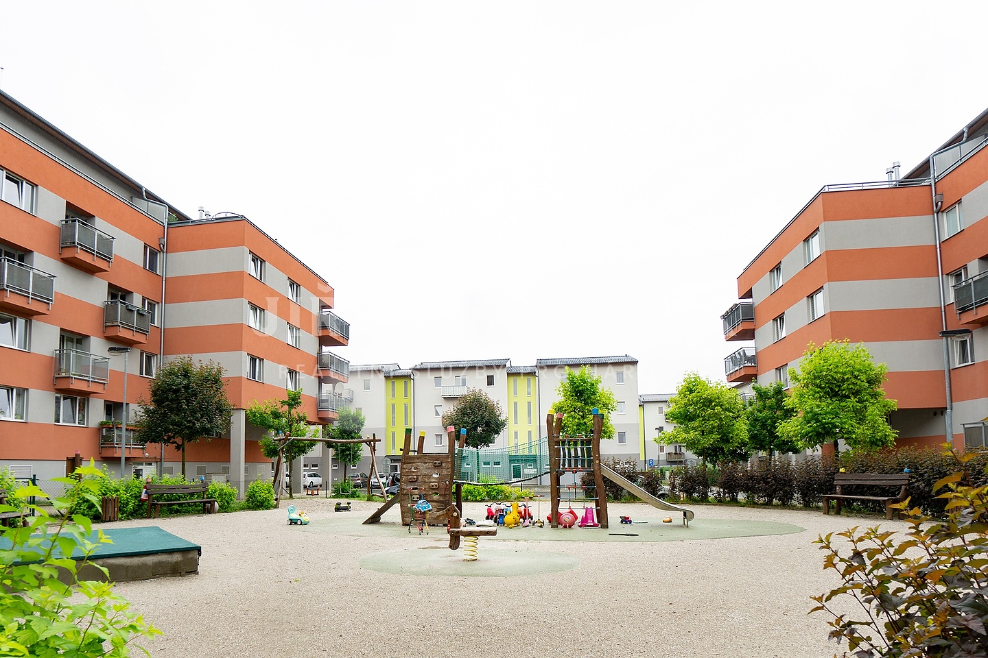 Byt se nachází ve třetím patře z celkových čtyř, ale nečekejte žádný přecpaný panelák. Dům je cihlový a na každém patře jsou pouze 4 byty. V budově nechybí ani výtah a bezpečnostní kamerový systém. Ve vnitrobloku navíc najdete soukromé oplocené hřiště. K bytu náleží jedno soukromé parkovací místo, takže se rozhodně nemusíte bát, že po příjezdu z práce nezaparkujete.